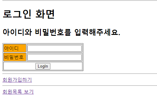 프로젝트 첫화면입니다. 로그인 화면입니다. 로그인 화면은 다음과 같이 구성되어 있다. 아이디와 비밀번호 입력창 회원가입 버튼 회원목록 보기 버튼(마리아 db안에 데이터 볼 수 있는 목록)(로그인 전에는 볼 수 없음) ● 아이디와 비밀번호가 일치하는 경우, '회원의 이름' 님의 마이페이지가 출력되며, 회원정보 수정 버튼 생성, 회원목록 보기(세션을 통해 로그인 후에는 볼 수 있어짐), 로그아웃 버튼 생성 ● 아이디와 비밀번호가 틀릴 경우, 입력값이 잘못되었다는 빨간 글씨와 아이디찾기와 비밀번호 찾기 버튼이 생성 만들때는 욕심나서 막 이것저것 추가해서 만들었는데, 블로그에 올릴려니까 너무 복잡하네요... 1 2 3 4 5 6 7 8 9 10 11 12 13 14 15 16 17 18 19 20 21 22 2..